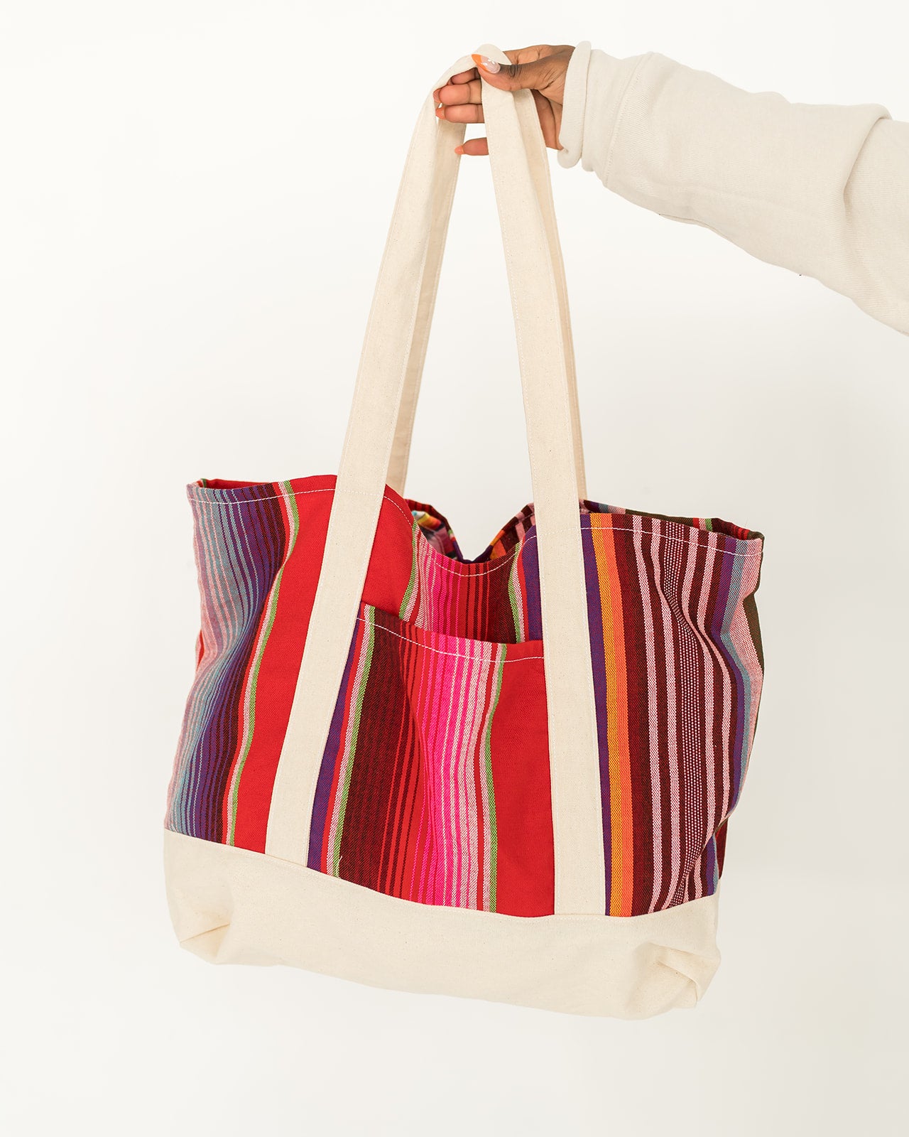 Carry it all with our Beach Weekender Tote. Fit your beach blanket, beauty bag, bikinis and so much more in this large canvas carry-all. Two outside pockets and scavenged vintage fabric.