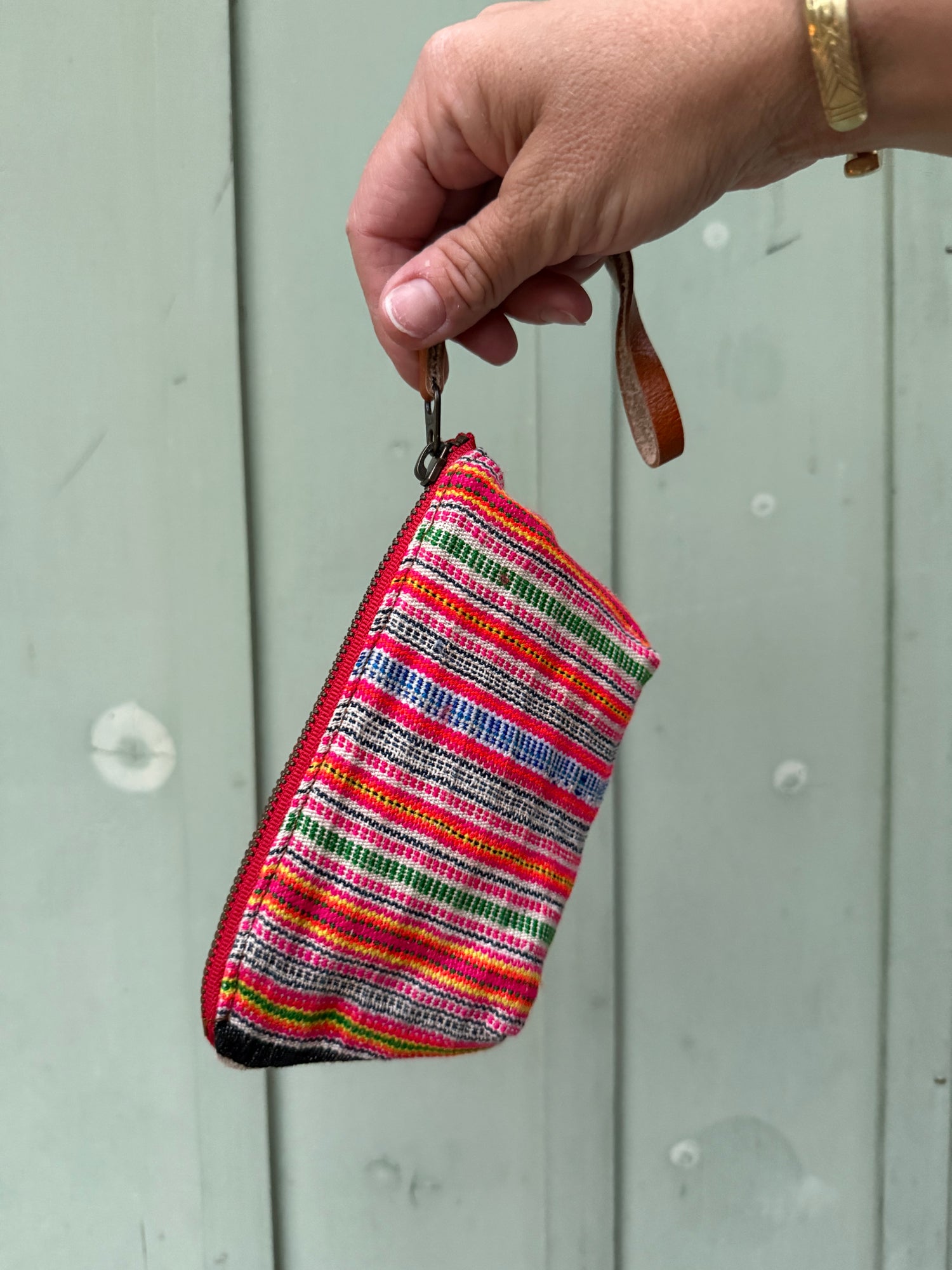 Harlow Moon in White Thai Stripe with Brown Leather Wristlet