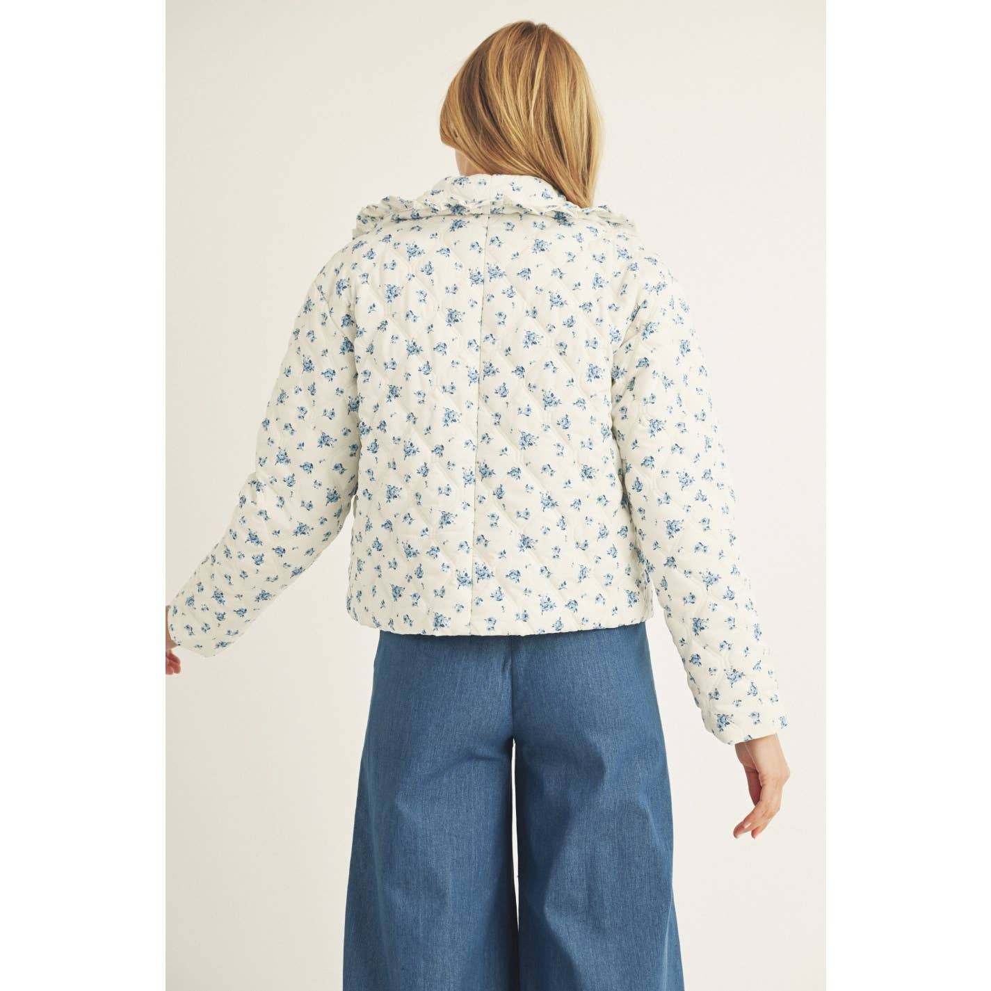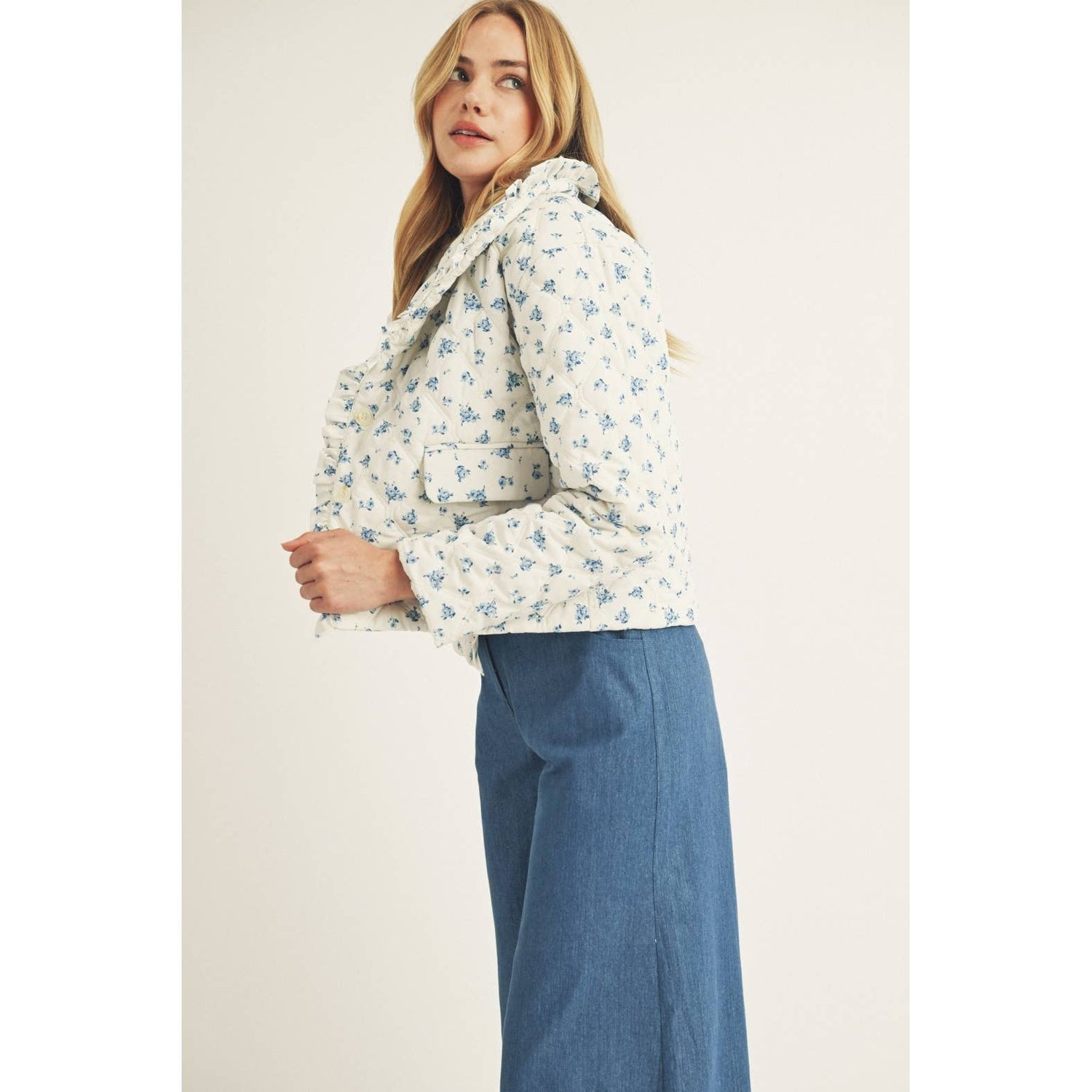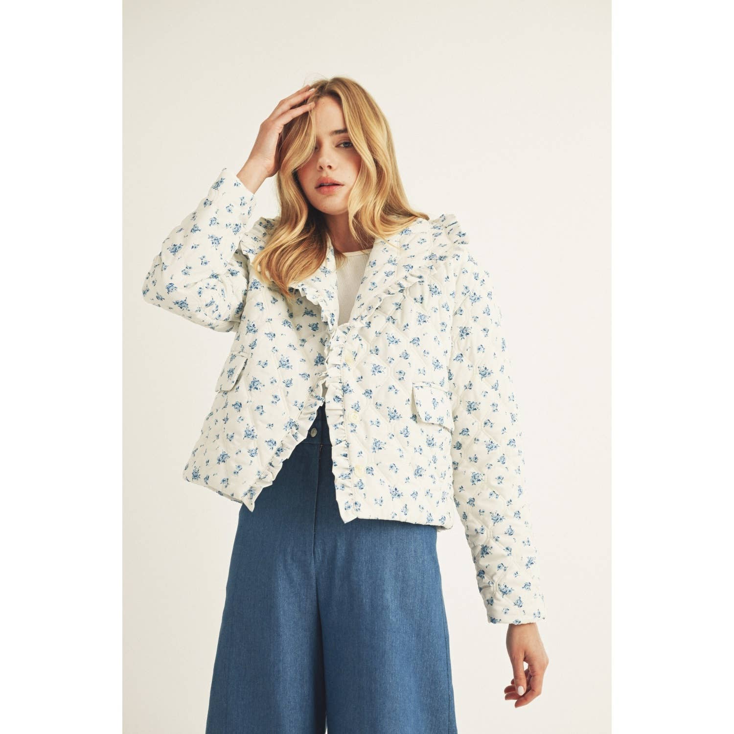 Blue rose print quilted puff jacket. It features a ruffled trim edge collar and front, front cream tortoise buttons, long sleeves, and side/front flap pockets.