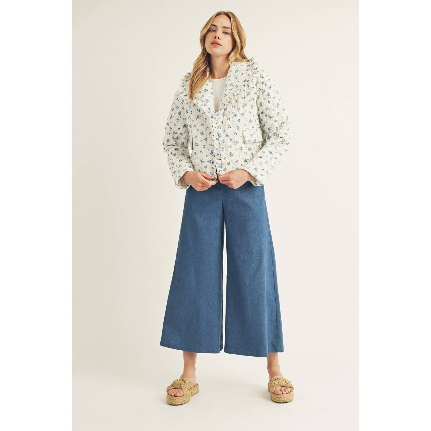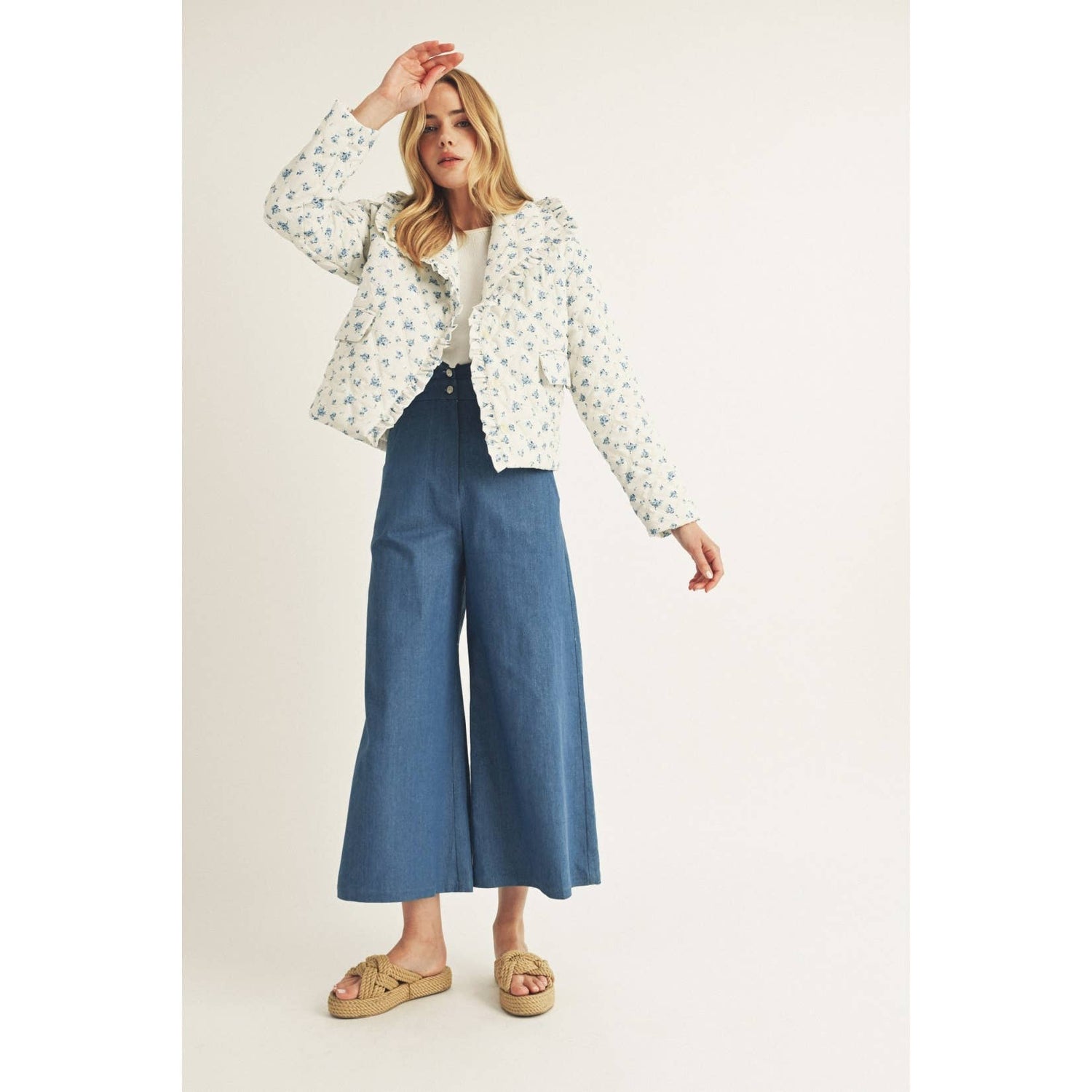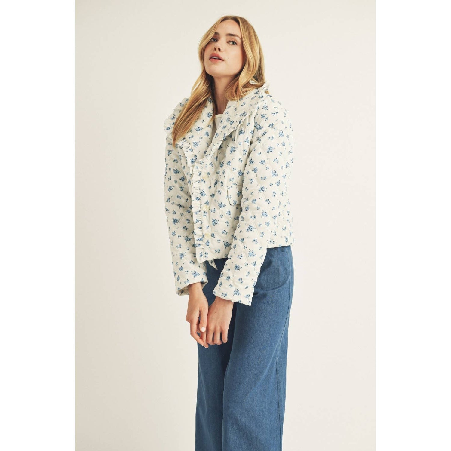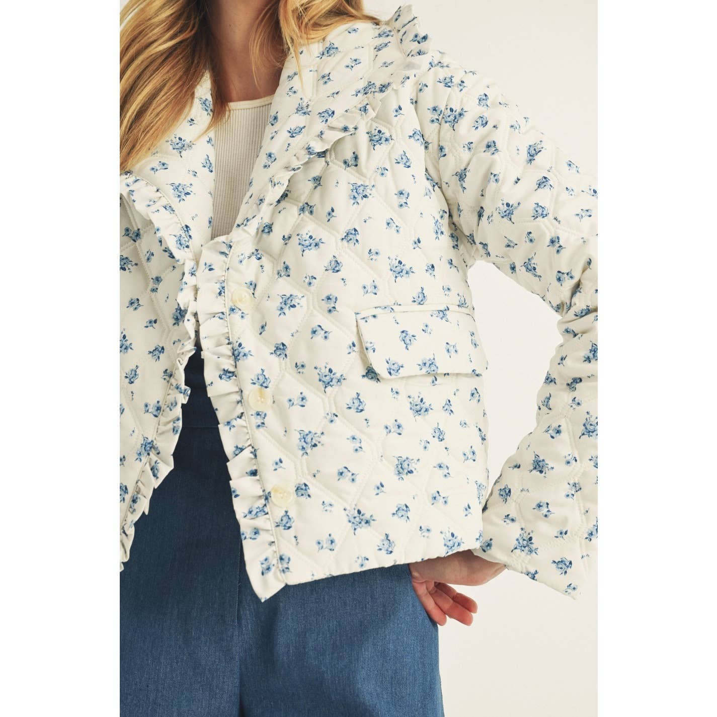 Blue rose print quilted puff jacket. It features a ruffled trim edge collar and front, front cream tortoise buttons, long sleeves, and side/front flap pockets.