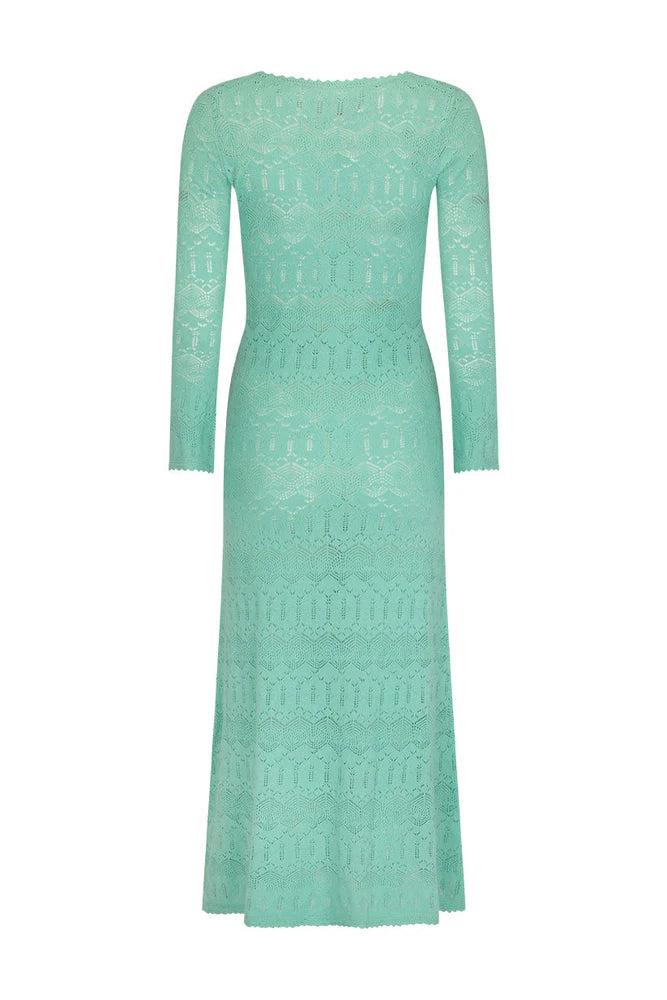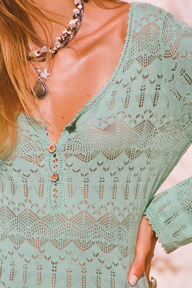 Crafted from a luxurious blend of organic cotton and linen, the Siesta Pointelle Dress in Seafoam is a striking addition to your wardrobe. Featuring a flattering scoop neckline, intricate pointelle knit design, and delicate scallop edges at the neckline, sleeves, and hem, this dress is a beautiful balance of comfort and elegance. The functional placket at the bust, adorned with sweet wooden flower-shaped buttons, adds a touch of vintage charm to this timeless piece. Pair with simple sandals or espadrilles for a rooftop soirée, or with heeled boots and a statement belt for some bohemian goddess glamour.