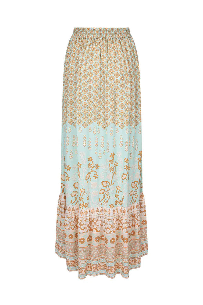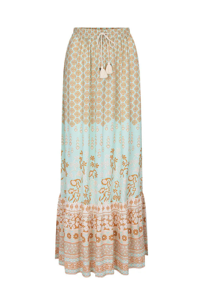 Our Sweet Nothings Maxi Skirt in Peppermint is crafted for the wild romantics. Sundrenched tones of aqua with sandy tan and hazy blush hues sweep across hand painted hearts and artful borders in full bloom. The voluminous silhouette floats effortlessly, while the elastic waistband with the drawstring and tassel trimmed ties ensures a perfect, comfortable fit. Pair it with the Sweet Nothings Sleeveless Blouse and a tan mule for dinner by candle light or with a simple cami and woven sandals for sunlit days by the water.