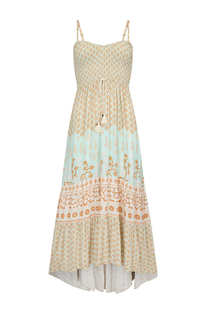 A love letter to soft, sun kissed afternoons, the Sweet Nothings Shirred Strappy Dress in Peppermint is a dreamy mix of coastal elegance meets playful romance. The delicate Peppermint and creamy tan tones meld together, creating a sun washed palette reminiscent of your favourite dress, lovingly reached for a thousand times before. The adjustable shoulder straps offer a perfect fit, while the high-low hem dances around your legs with whimsical ease. A shirred bodice and cotton drawstring ties with tassels and bells at the waist offers a tailored fit for a look that’s both flattering and oh so romantic. Pair with espadrilles and a straw hat for an idyllic day spent outdoors, or for the cooler months, layer a skivvy underneath and boots for easy transeasonal styling.